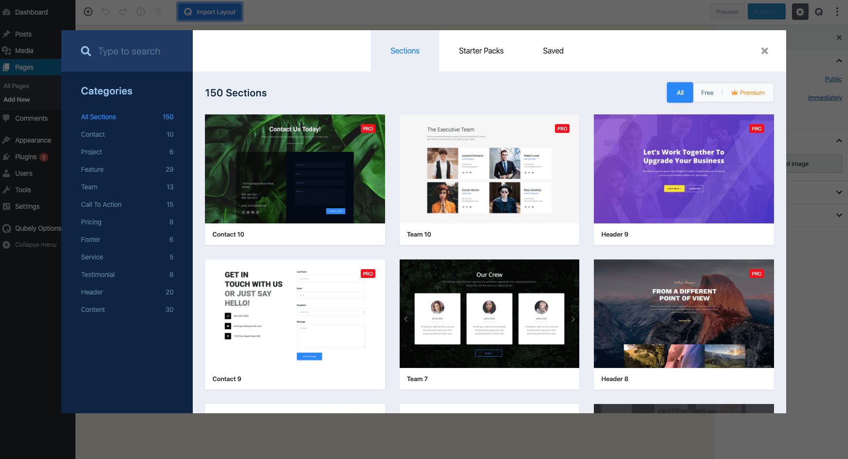 Sections - Qubely ได้สร้าง layout ของ section ต่างๆไว้ให้สามารถเลือกใช้ได้เลย (pre-made) โดยแบ่งออกเป็นหมวดหมู่ประเภทต่างๆ (Contact, Project, Feature, Team, Call to action, Pricing, Footer, Service, Testimonials Header, Content) เรียกง่ายๆว่าเราสามารถเลือกประกอบร่างส่วนต่างๆออกมาได้เลย