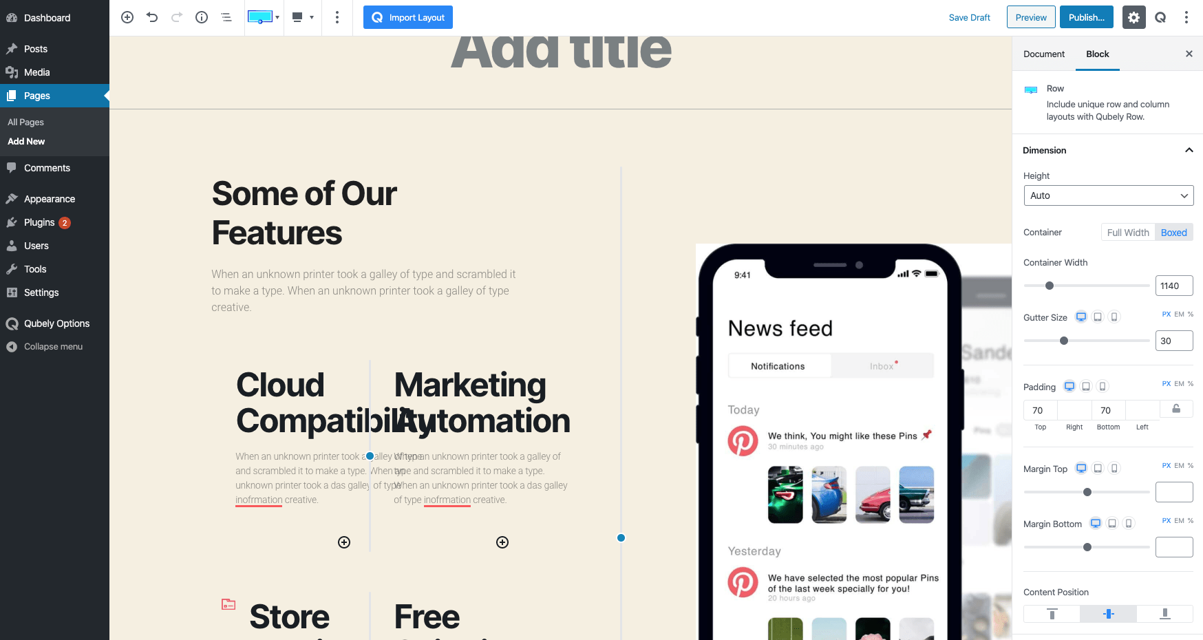 ในเรื่องของการ Config ส่วนต่างๆของ Qubely เองก็ทำออกมาได้ค่อนข้างครบถ้วนเลยทีเดียว ตัวอย่างเช่นการจัดการ Row นั้น ไม่ว่าจะเป็นการควบคุมความสูง, ความกว้าง, Padding, Margin, Gutter Size เรียกว่าสามารถคุมได้แทบทุกอย่าง