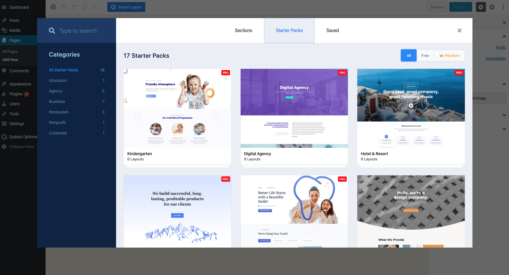 Starter Packs - นอกจาก Qubely จะสร้าง Sections Pre-Made ไว้ให้เราเลือกใช้แล้ว Starter Packs นี่จัดมาให้เต็มและง่ายกว่าเดิม คือเรียกง่ายๆว่าสร้างมาให้ทั้งหน้าเลย โดยแยกหมวดหมู่ไว้เช่นกัน (Education, Agency, Business, Restaurant, Nonprofit, Corporate) โดยที่เราสามารถเลือก layout ที่ตรงกับที่เราต้องการมาใช้งานได้เลย หรือจะแก้ไขเพิ่มเติมในแต่ละส่วนก็สามารถทำได้ เพราะมี option ให้สามารถ config แยกได้แทบจะทุกจุด